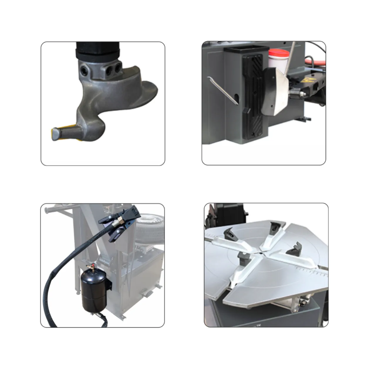 A Máquina de Desmontar Pneus Automática está equipada com uma torre pneumática basculante e um eixo hexagonal robusto de Ø41 mm, garantindo resistência e durabilidade. Possui bloqueio pneumático simultâneo dos braços horizontal e vertical, com posicionamento automático da cabeça, que inclui peças plásticas intercambiáveis para proteger a jante. A coluna de alta rigidez assegura estabilidade em todas as posições de trabalho, enquanto a mesa giratória, acionada por motor elétrico, permite rotação nos dois sentidos. A pedaleira é removível, facilitando a manutenção. Inclui ainda um kit de proteção para a sapata, cabeça e mandíbulas, bem como um sistema insuflador com canhão de ar (bazuca) para enchimento rápido dos pneus. Está também equipada com filtro de lubrificação e regulador de pressão.
